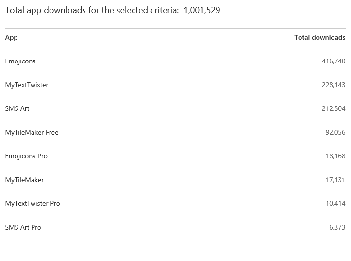 Below you can find download stats. Don’t forget to check out my apps in Windows Phone store and download them please for the next million. ![]()